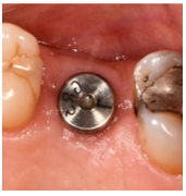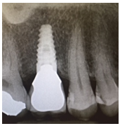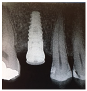 Patient presented 10-weeks after the implant placement, proper osseointegration was confirmed and the fixture was restored by a specialist Prosthodontist. At the 1-year supportive periodontal appointment, a diagnosis of healthy peri-implant tissues was confirmed (Figure 3 and 4).