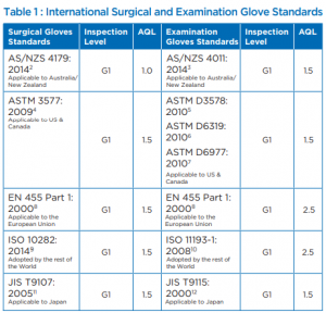 AQL is an internationally recognised industry standard statistical sampling process for evaluating quality and measuring the percentage likelihood of pinhole defects in a manufactured batch of gloves. Various international standards, as shown in Table 1, determine the AQL that manufacturers must comply to. Manufacturers can also set their own standards as long as they are stricter than the international standards dictated. The lower and stricter the AQL, the lower the chance of finding a defect in the batch of gloves, and the higher the quality of the product.