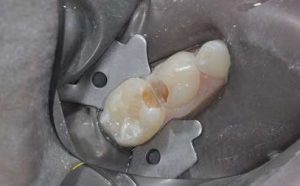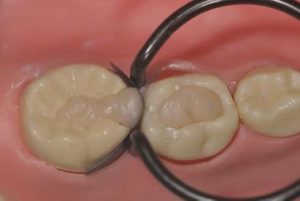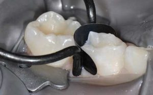 Their use is indicated both for deciduous dentition and immature or mature permanent dentition. Condensable glass ionomers are an excellent alternative to amalgam and also to composites in terms of biocompatibility. Although the material is reputed to possess lo w technique-sensitivity, operating protocols must be followed. Indeed, many failures stem from noncompliance with the working time, a poor choice of matrix, poorly adapted preparation or injection of an inadequate amount of material leading to air bubbles or issues with the seal. Humidity must also be controlled to guarantee that restorations will last. The use of a dam is optional but, as well as controlling humidity, using one provides greater comfort to both the young patient and the practitioner. The quality of the matrix is crucial for the success of the restoration (Fig. 4). Figures 5 to 12 show the placement of a sealant on 36 using Fuji Triage (GC)*, from GC with the press finger technique.