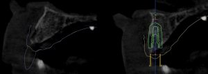 TIP: The accuracy of image registration between the CBCT and IOS scans can be improved with radiographic markers (composite blobs). Removing sources of radiographic scatter (in this case, the PFM bridge) also improves the accuracy. Fig. 3